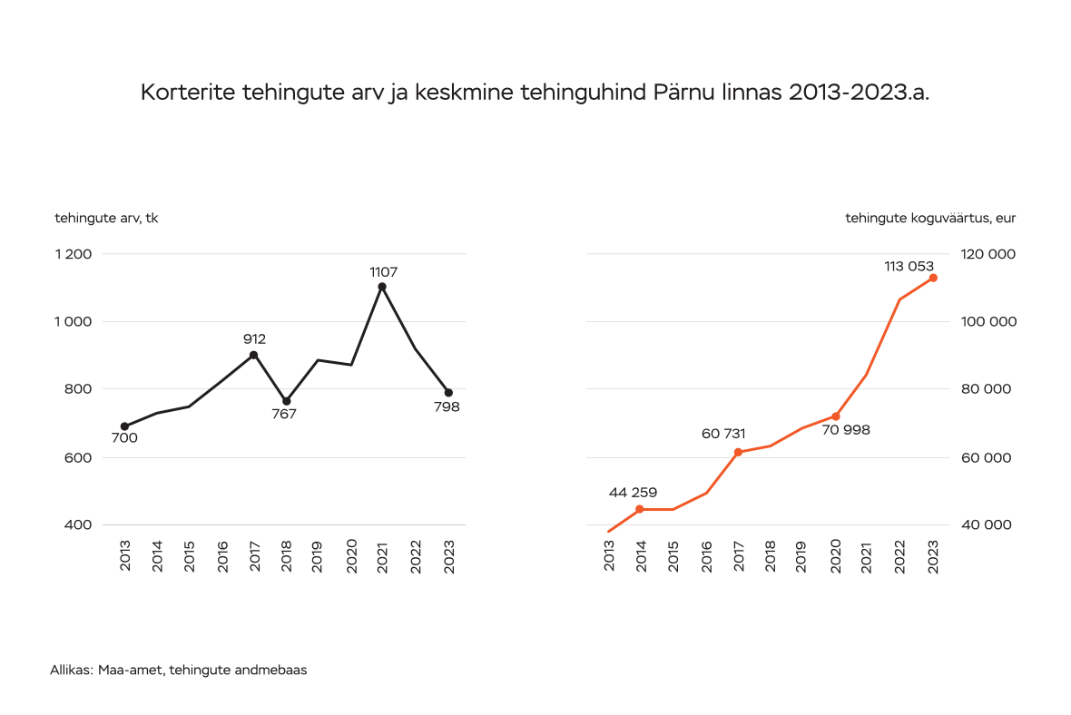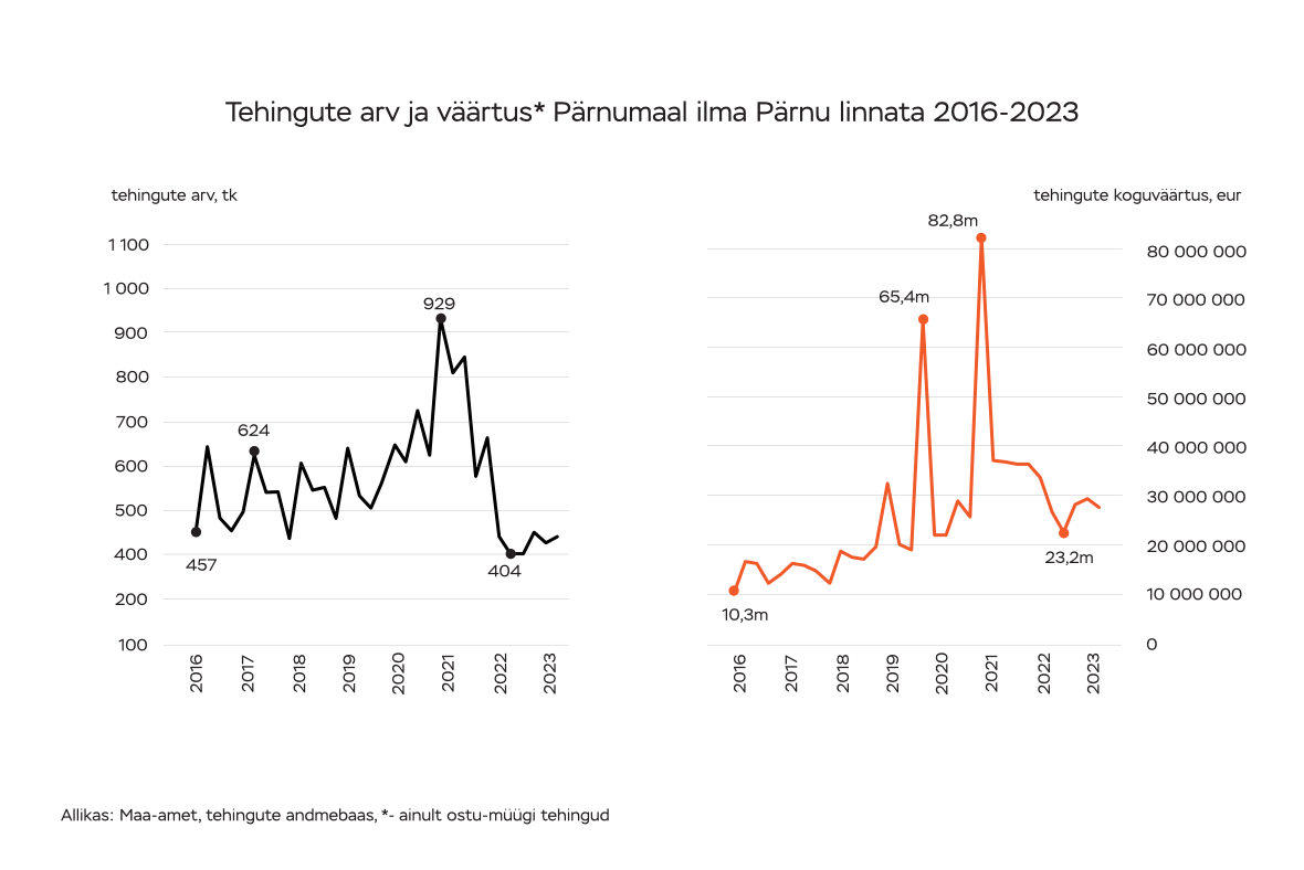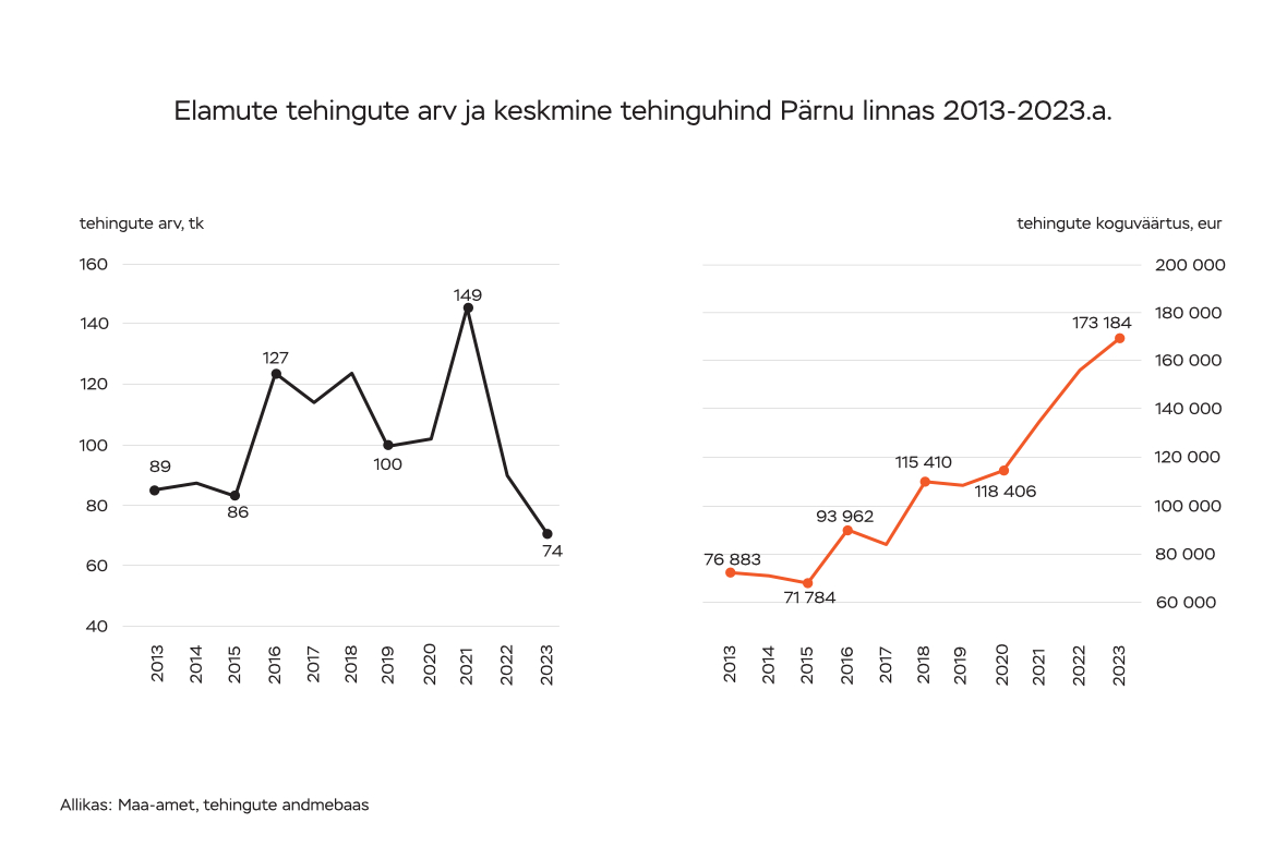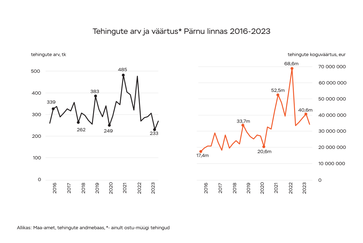 Pärnu linnas langesid 2023. aastal aastases võrdluses nii tehingute arv, rahaline koguväärtus kui keskmine tehinguhind. 2023. aastal tehti Pärnu linnas 1099 kinnisvara ostu-müügi tehingut koguväärtusega 147,77 milj eurot. Võrreldes 2022. aastaga langes tehingute arv 19% ning tehingute rahaline maht vähenes 24 %. Keskmiseks tehinguhinnaks 2023. aastal kujunes Pärnu linnas 134 459 eurot. Võrreldes 2022. aastaga langes keskmine tehinguhind ca 6%, mil keskmine tehinguhind oli 143 665 eurot.