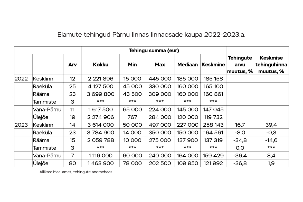 Kõige rohkem tehti tehinguid 2023. aastal Raeküla linnaosas paiknevate elamutega (23 tehingut), sellele järgnesid Rääma, Kesklinn ja Ülejõe vastavalt 15, 14 ja 12 tehinguga. Kõige vähem tehti tehinguid Tammiste linnaosas, kus omanikku vahetas 3 elamut. Kõige kõrgem elamu keskmine tehinguhind oli traditsiooniliselt Kesklinnas (ca 258 000 eurot) ning kõige madalam Ülejõe linnaosas (ca 122 000 eurot).