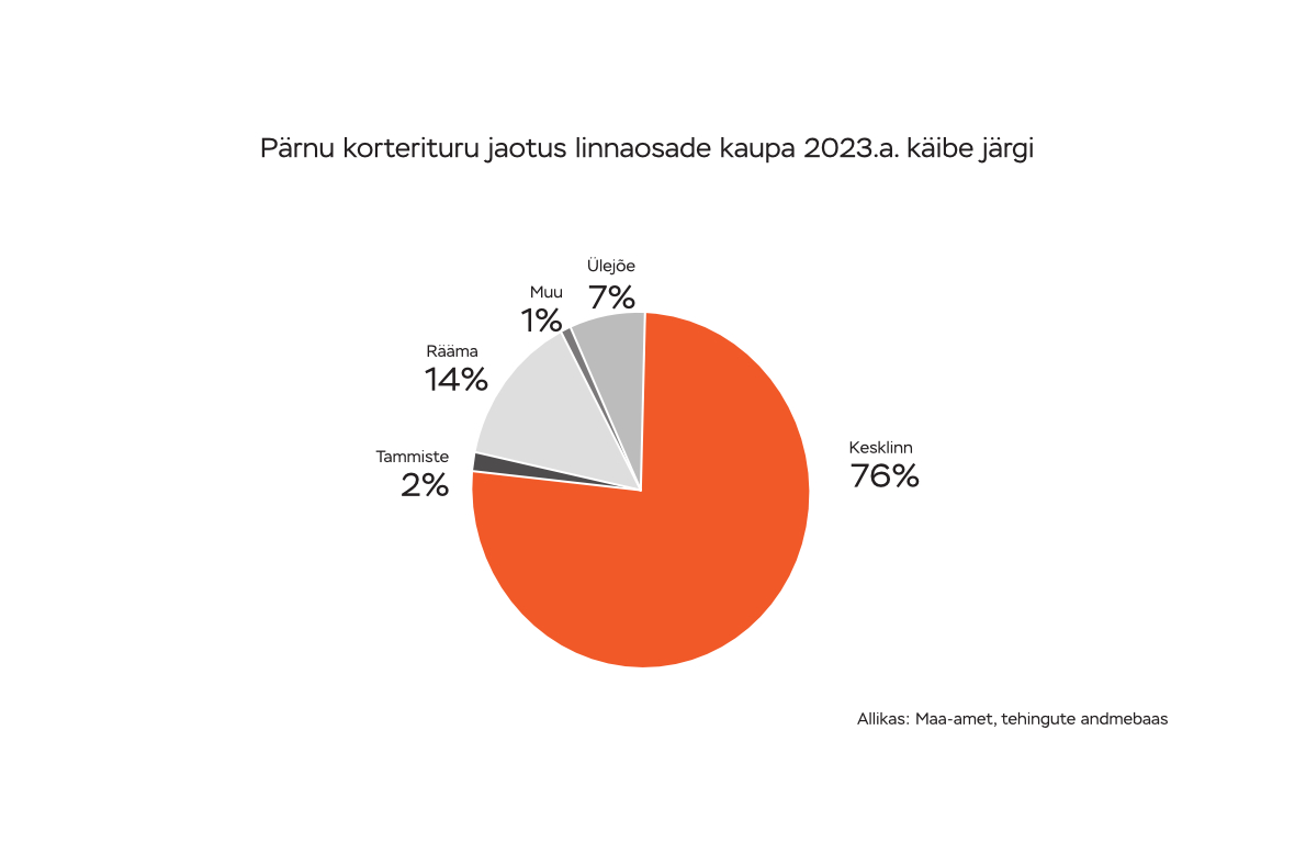 Kõige rohkem tehinguid tehti 2023. aastal Kesklinnas, 73% kogu Pärnu linna korterite kogukäibest. Rääma linnaosa korterite tehingud moodustasid 14% Pärnu korterite tehingute kogumahust ning Ülejõe linnaosa korterite tehingud 7%. Ülejäänud linnaosade osakaal kogu Pärnu korterituru mahust oli marginaalne.