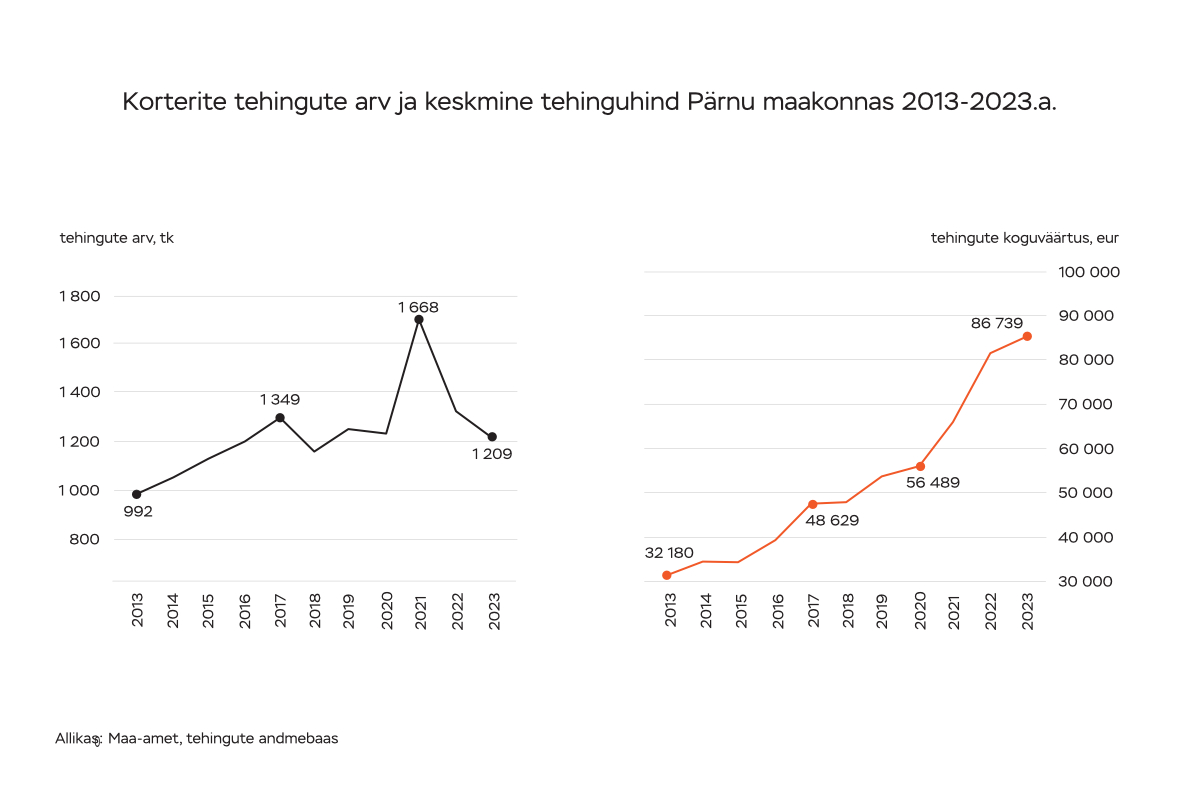 Maa-ameti tehinguandmetele tuginedes tehti 2023. aastal Pärnu maakonnas tervikuna kokku 1 209 ostu-müügitehingut korteriomanditega (eluruumidega) kogusummas 104,867 miljonit eurot. Võrreldes 2022. aastaga langes tehingute arv 11%, tehingute koguväärtus langes aastases võrdluses 7,5%. Keskmiseks korteri tehinguhinnaks kujunes Pärnumaal 2023. aastal 1 655 eur/m² ning mediaanhinnaks 1 580 eur/m², mis tõusid aastases võrdluses vastavalt 5% ja 2%.