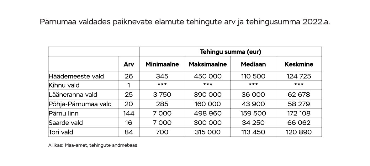Elamute tehinguhinnad jäid 2023. aastal vahemikku 10 000 – 497 000 eurot. Keskmiselt müüdi igas kuus 6 elamut. Pärnu linnas on väljakujunenud 6 elamupiirkonda: Kesklinn, Ranna rajoon, Raeküla, Rääma, Ülejõe ja Vana-Pärnu, statistikas eristatakse ka Tammiste linnaosa.