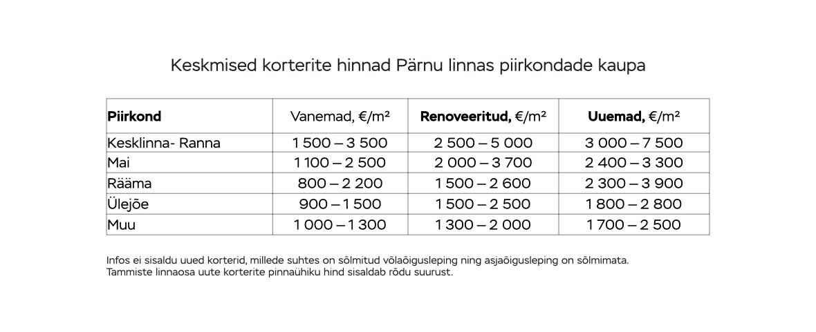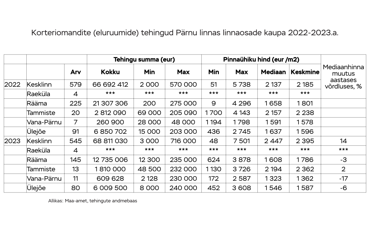 Korteri mediaanhind oli 2023. aastal kõige kõrgem üllatuslikult Tammiste linnaosas, milleks kujunes 2 159 eur/m². Selle põhjuseks on asjaolu, et Tammistes on müüdud vaid uuselamutes paiknevaid kortereid. Tammistele järgnesid Kesklinna linnaosa 2 138 eur/m², Rääma linnaosa 1 659 eur/m² ja Ülejõe linnaosa 1 637 eur/m². Kesklinnas korteri ruutmeetri mediaanhind tõusis aastases võrdluses 37%, Tammiste linnaosas 30%, Rääma linnaosas 47%, Ülejõe linnaosas 36% ning Vana-Pärnu linnaosas koguni 89%.