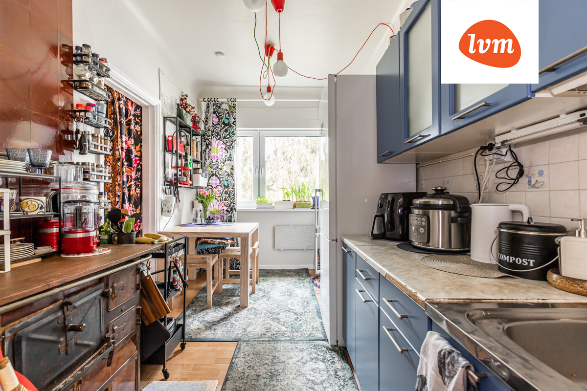 Uksed on asendatud kangastega, mis lisavad ruumile hubasust ja tekstuuri. Soojades toonides kardinate vahelt jõuab kööki, kus vastanduvad uus ja vana, disain ja omalooming. Piklik köökki paistab endas vastandeid kandvat: üks pool on soe – ahi, puit, soojad toonid ja punased detailid, ning teine jahe – külm sinine värv kappidel, metall ja külmkapp. Vaevalt see tahtlikult nii sätitud, ent ootamatusi täis kodus mõjub seegi loomulikult ja koduselt.